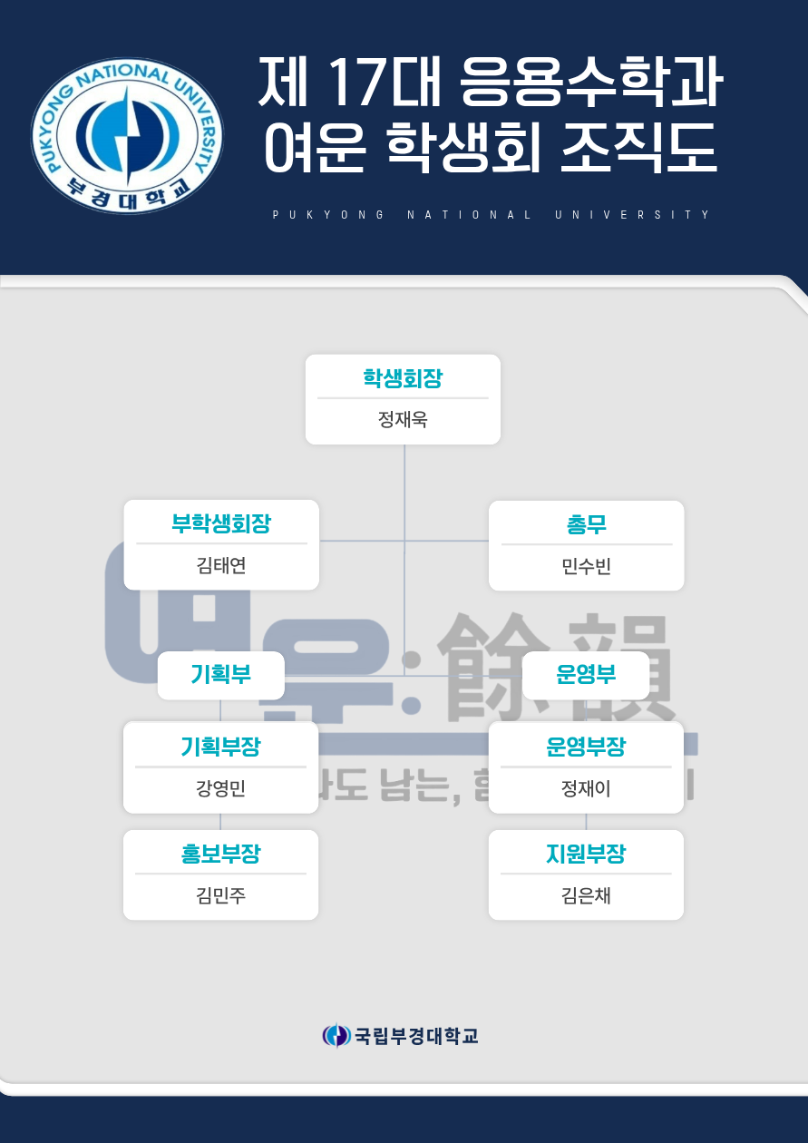 반갑습니다. 국립부경대학교 제17대 응용수학과 여운 학생회 학생회장 정재욱입니다.